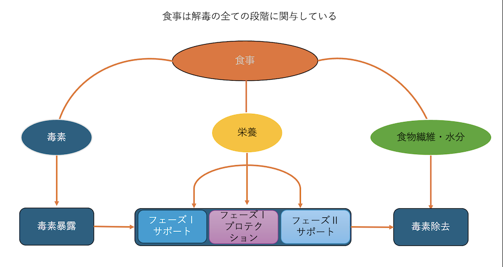 毒素の侵入(毒素 → 毒素暴露) 私たちは日々、食材や環境から化学物質を体内に入れます。これが「毒素曝露」の出発点です。まずは曝露源をできるだけ減らすことが前提になります。 食事が全段階を支える(Food) 食事から得る「栄養(Nutrients)」と「食物繊維+水分(Fiber & Hydration)」が、解毒の各ステップをサポートします。 第I相の支援(Phase I Support) 肝臓の酵素が毒素を“下ごしらえ”して扱いやすくする段階です。ここは栄養(ビタミン・ミネラル・植物成分など)が働きを助けます。 第I相の保護(Phase I Protection) 第I相の途中で一時的に反応性の高い中間体ができます。抗酸化・保護作用をもつ栄養が、ここで細胞を守ります。 第II相の支援(Phase II Support) 抱合(アミノ酸などを結合)して水に溶けやすい形に変え、体外へ出しやすくします。この工程も栄養(特にアミノ酸など)が不可欠です。 排泄(Toxin Elimination) 最終的に便・尿(+汗・呼気)として排出します。ここで「食物繊維と十分な水分」が通り道を整え、運び出しを後押しします。 「曝露を減らす」→「栄養で第I相・保護・第II相を支える」→「食物繊維と水分でしっかり排泄」という一直線の流れを、食事がすべての段階で支えることになります。食事内容次第で、毒素が溜まることもあるし、解毒してくれることもあるってことですね。