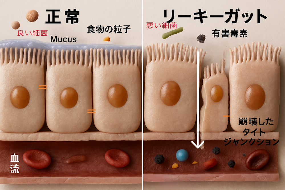 その結果、腸の細胞どうしをつないでいる「すき間ガード(タイトジャンクション)」崩壊し、未消化の食べものや毒素が体内に漏れやすい――いわゆるリーキーガット(腸漏れ)症候群へ繋がります。