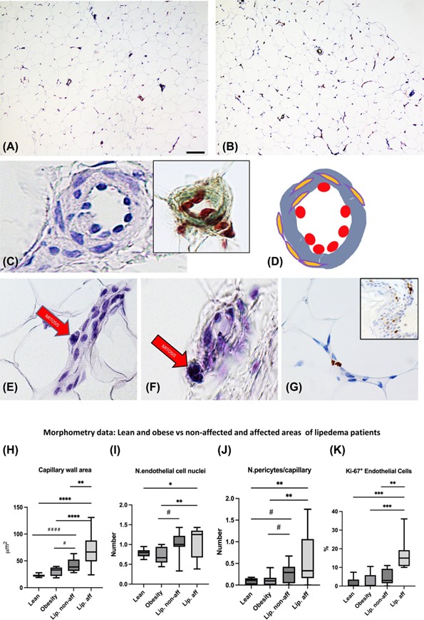 結果として、脂肪浮腫の患者では毛細血管壁面積、内皮細胞核数、周皮細胞数はいずれも有意に高く、Ki-67陽性内皮細胞の割合が肥満患者、やせ型患者よりも増加していました。