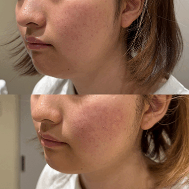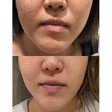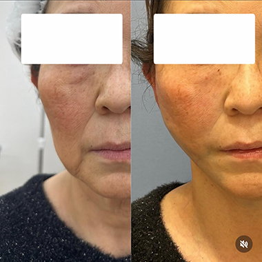 顎下の梅干しじわをオリディア240で凸凹矯正し、頬はジャルプロスーパーハイドロを2回施術し皮下靭帯を引き締めています。